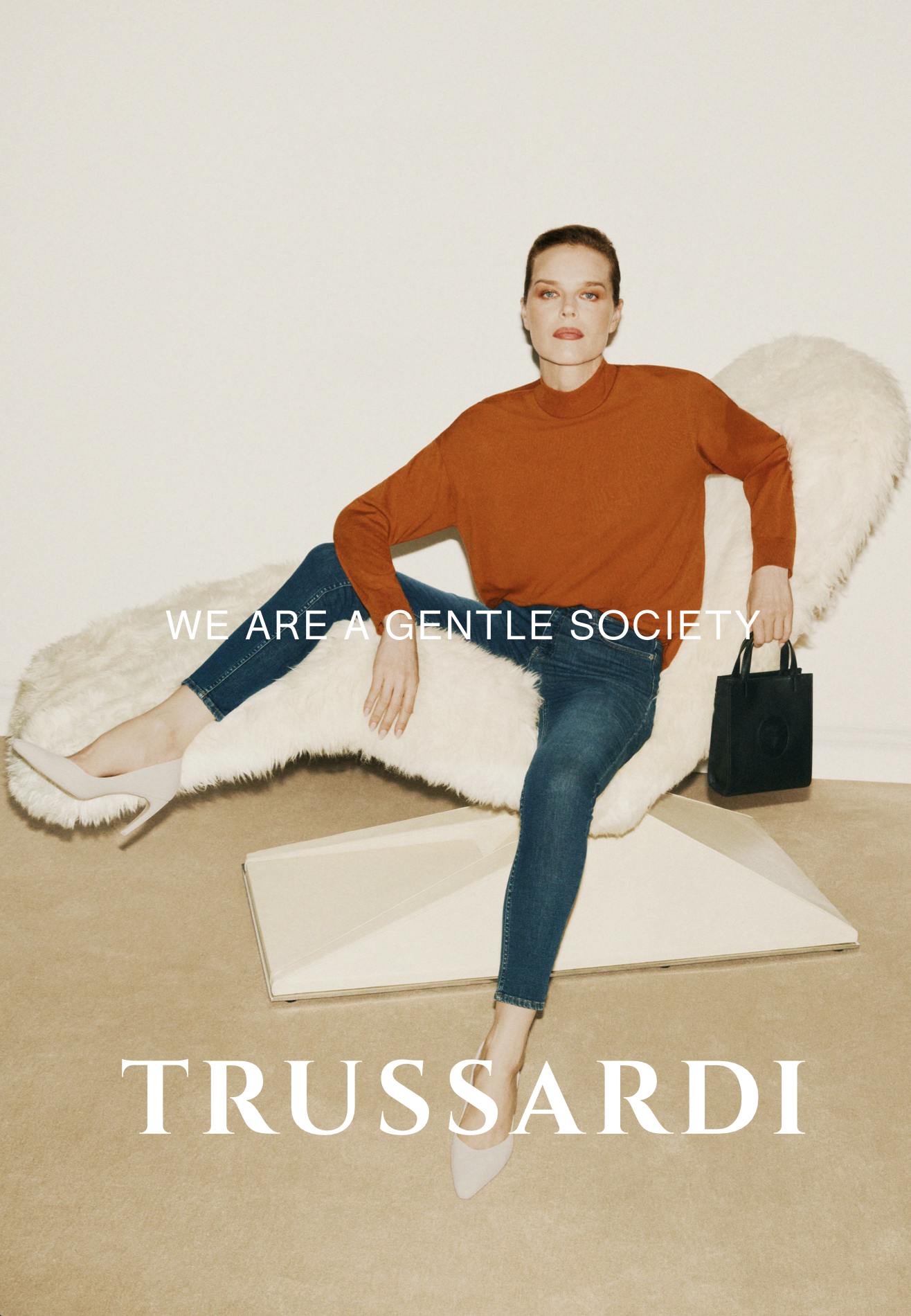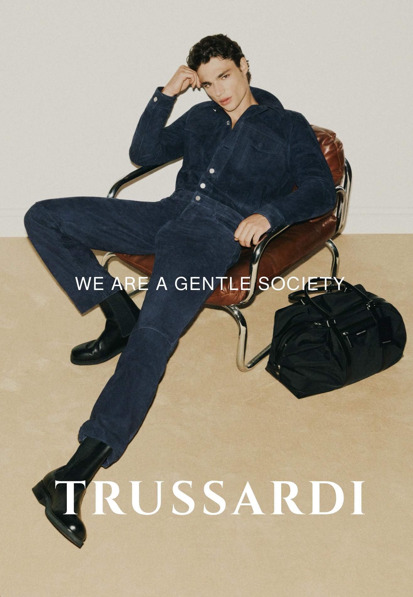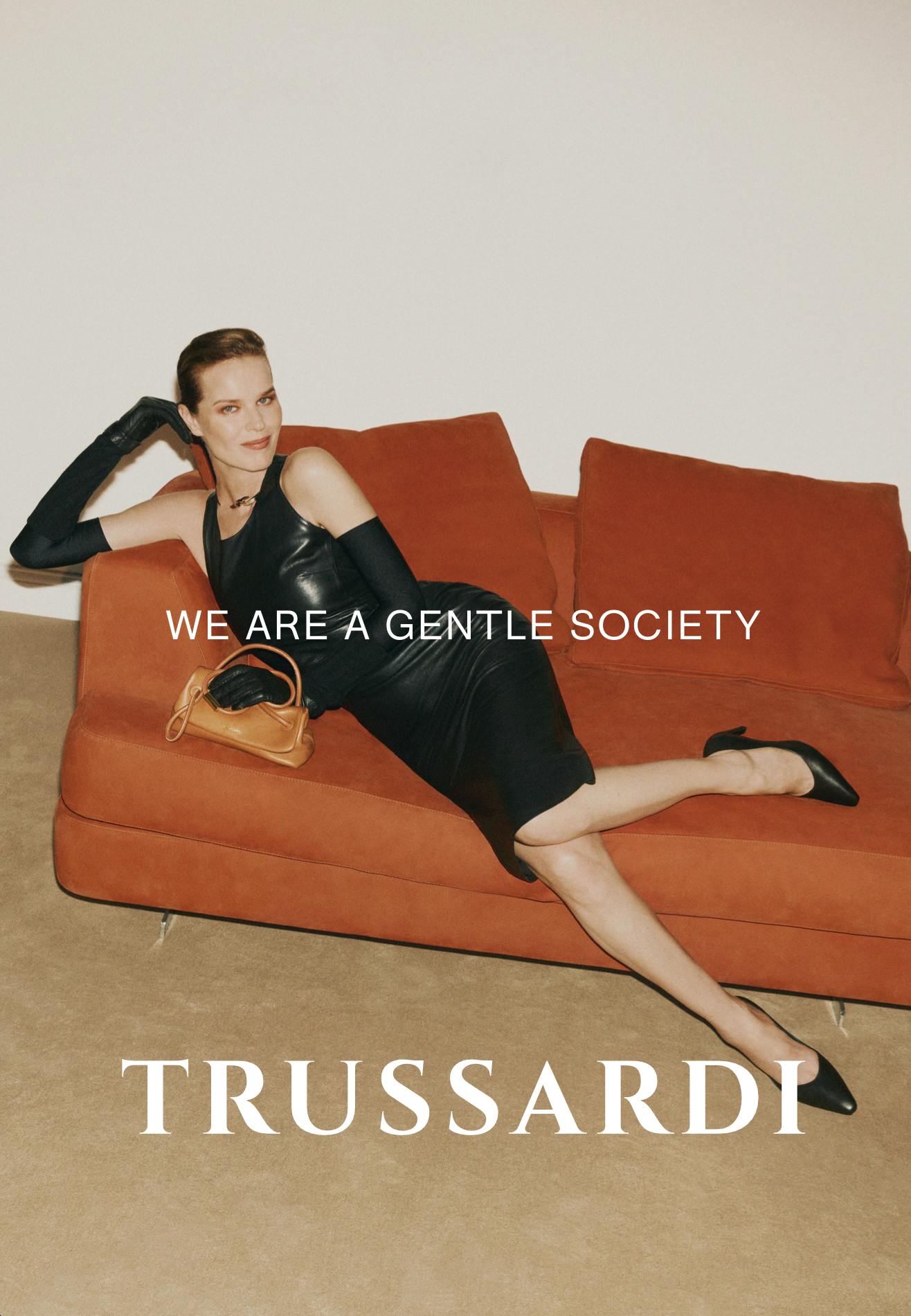 The Gentle Society : the rebranding campaign directed by Simone Yang and Amore Global, in collaboration with the Trussardi team, shot in Milan, July 2025, with Fernando Lindez and Eva Herzigova.
